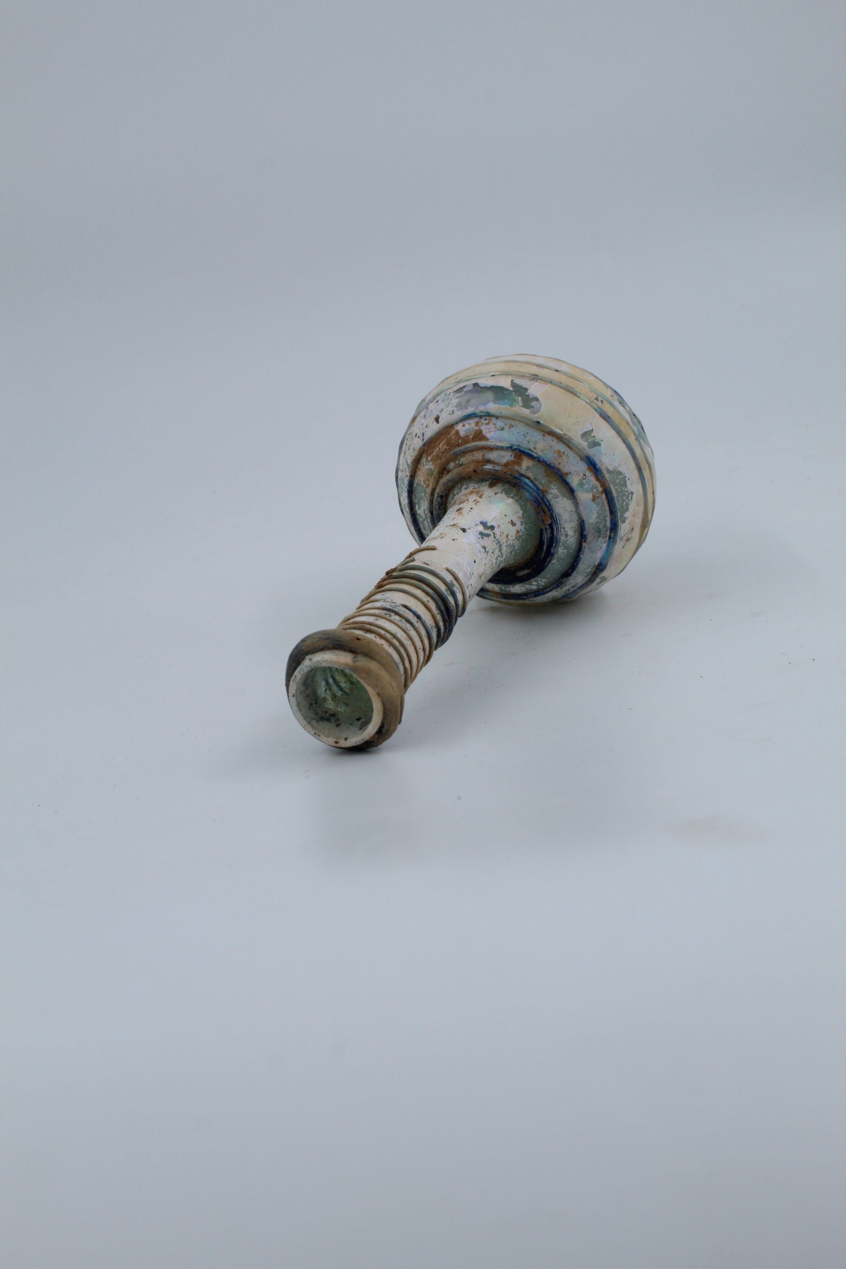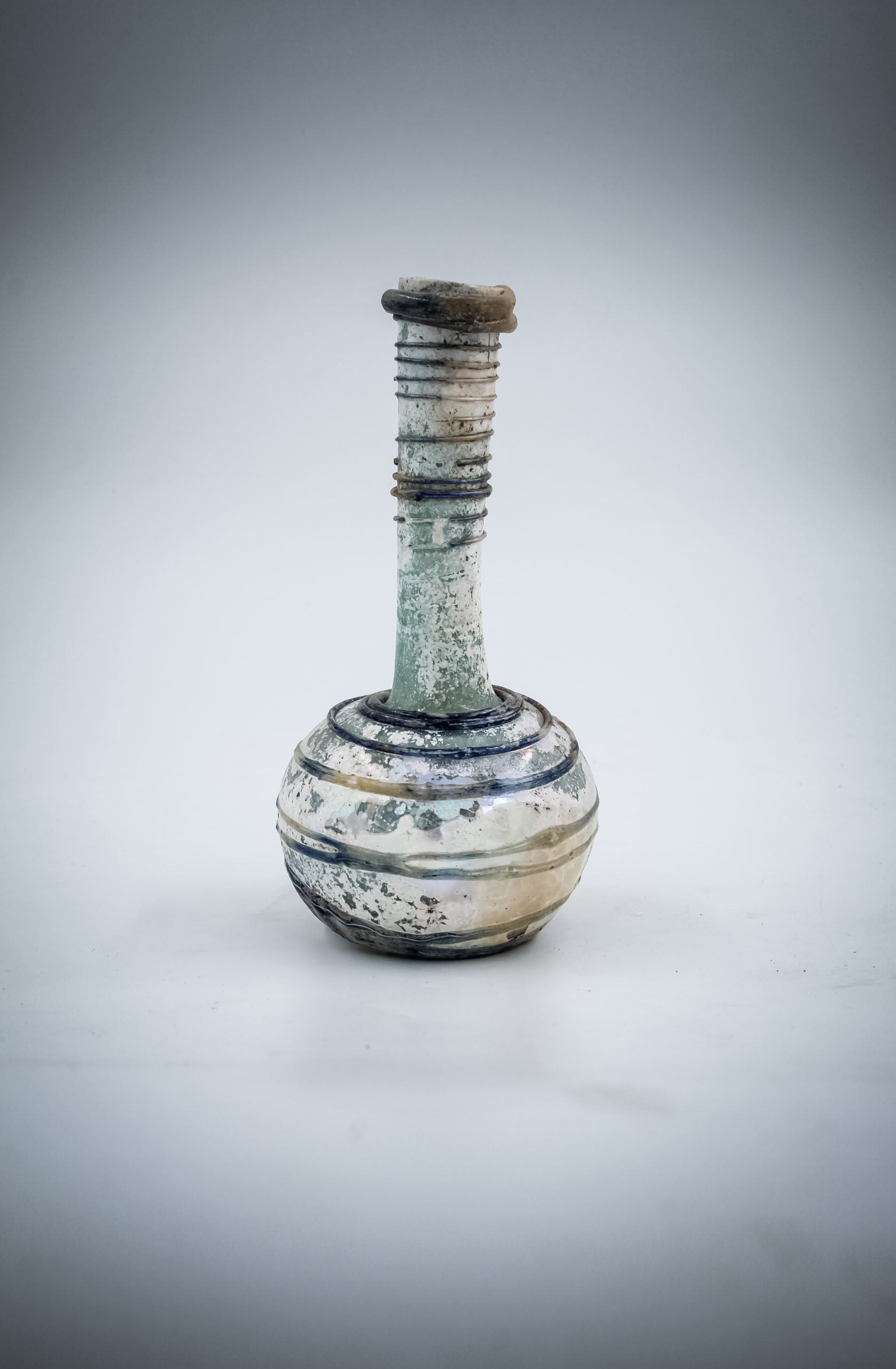 A green glass bottle from the Byzantine period, dating back to the 4th to 6th century CE. The bottle measures 13.1 cm in height and features decorative trails running from top to bottom. It has a beautiful silver patina and is in very good condition.