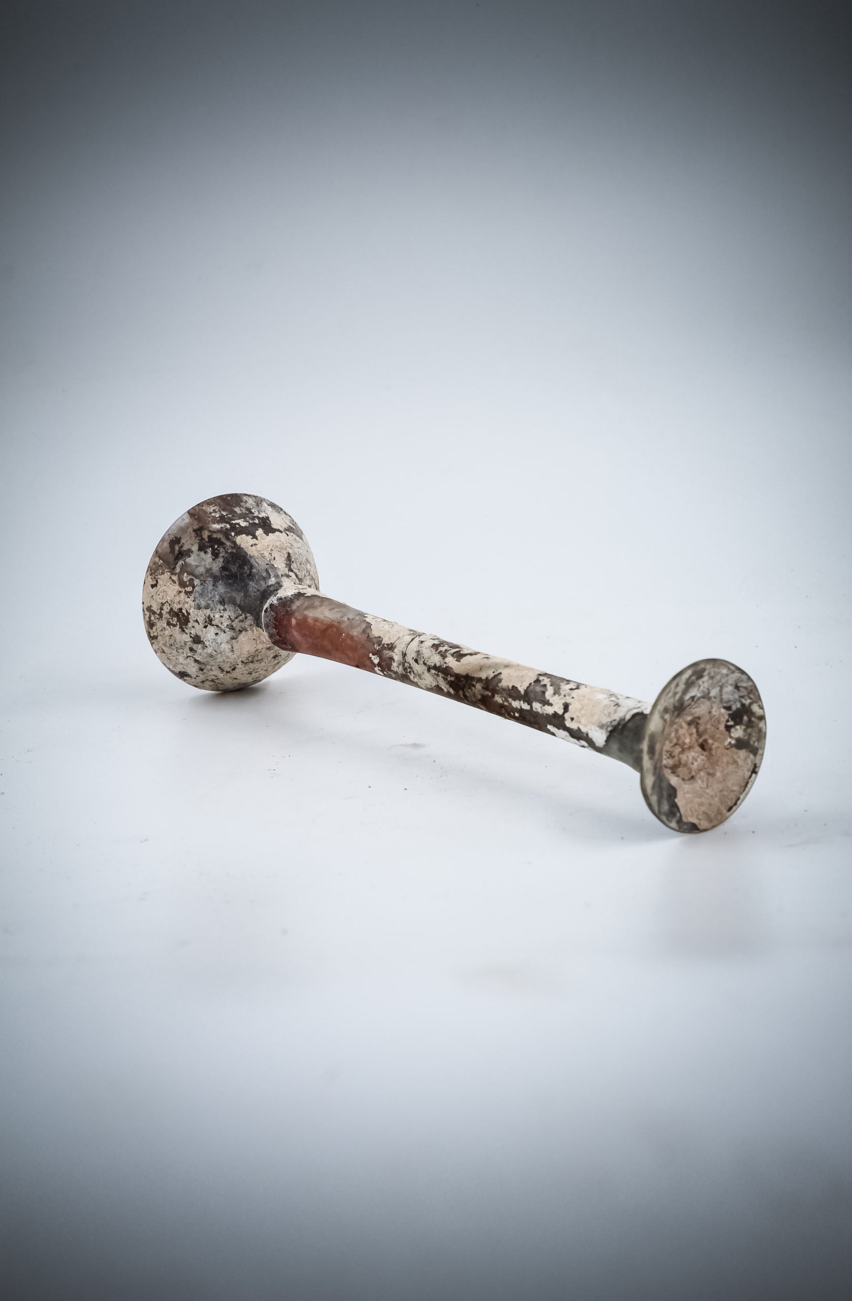 This artifact is a blown tubular ledge rim bottle with a cylindrical neck extending toward the bottom and a squat spherical body on a flat base. Popular throughout the Roman Empire, these bottles held perfumes and scented oils and were often placed in burial caves, earning the name "tear bottles" for collecting the tears of mourners.