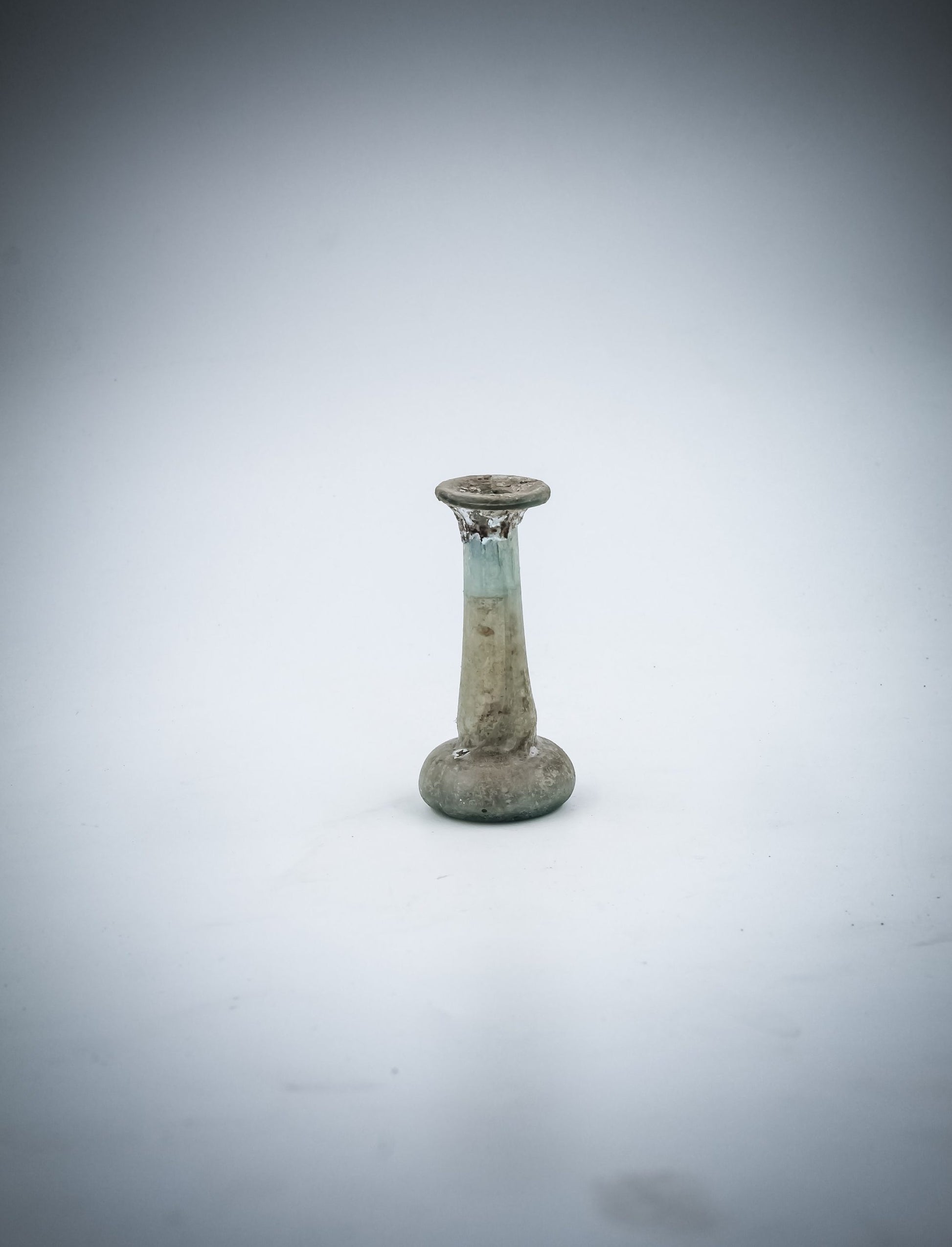 Time of Jesus 1st Century AD. Blown Tubular ledge rim, folded inward, cylindrical neck widening toward the bottom and constructed at the junction with squat globular body, flat base. This type of bottle was popular during the Roman period all throughout the Empire, exhibiting very little variation. Used as containers for perfumes and scented oils, they were frequently placed in burial caves and are thus sometimes referred to as “tear bottles,” believed to have been used for collecting the tears of mourners. From the Bible, the tradition of collecting tears in bottles is mentioned by King David. In Psalms 56:8, “…put my tears into your bottle, are they not written in your book?” In Luke 7:38, a sinful woman washes Jesus’ feet with her tears and dries them with her hair. These tears were probably saved and carried in a bottle such as this one. The tear collecting bottle is a unique piece of history from the time of Jesus, which symbolizes repentance in Christ. Comes with a certificate of authenticity and all required documents for export approval. Shipped direct from the Holy Land.