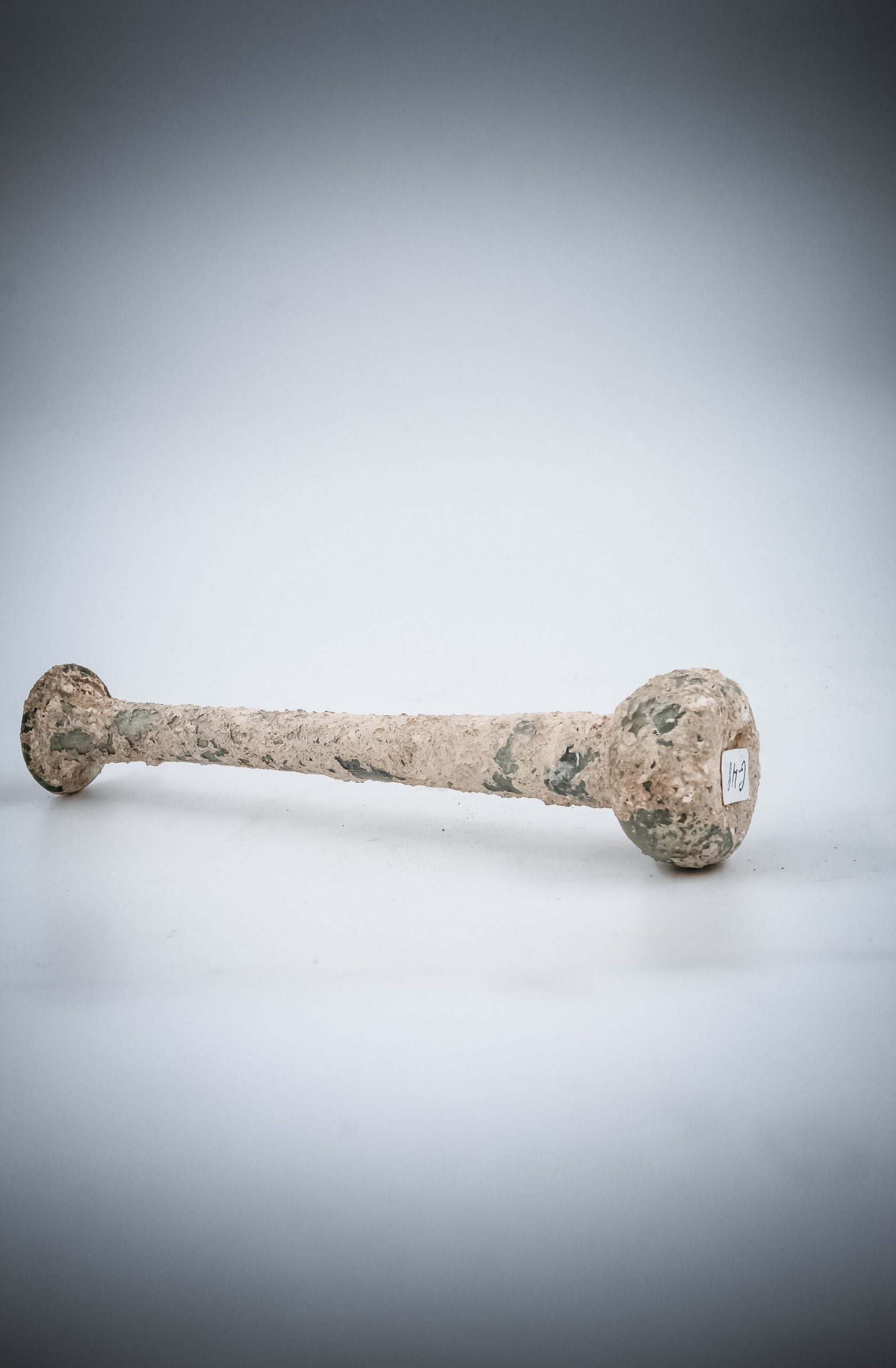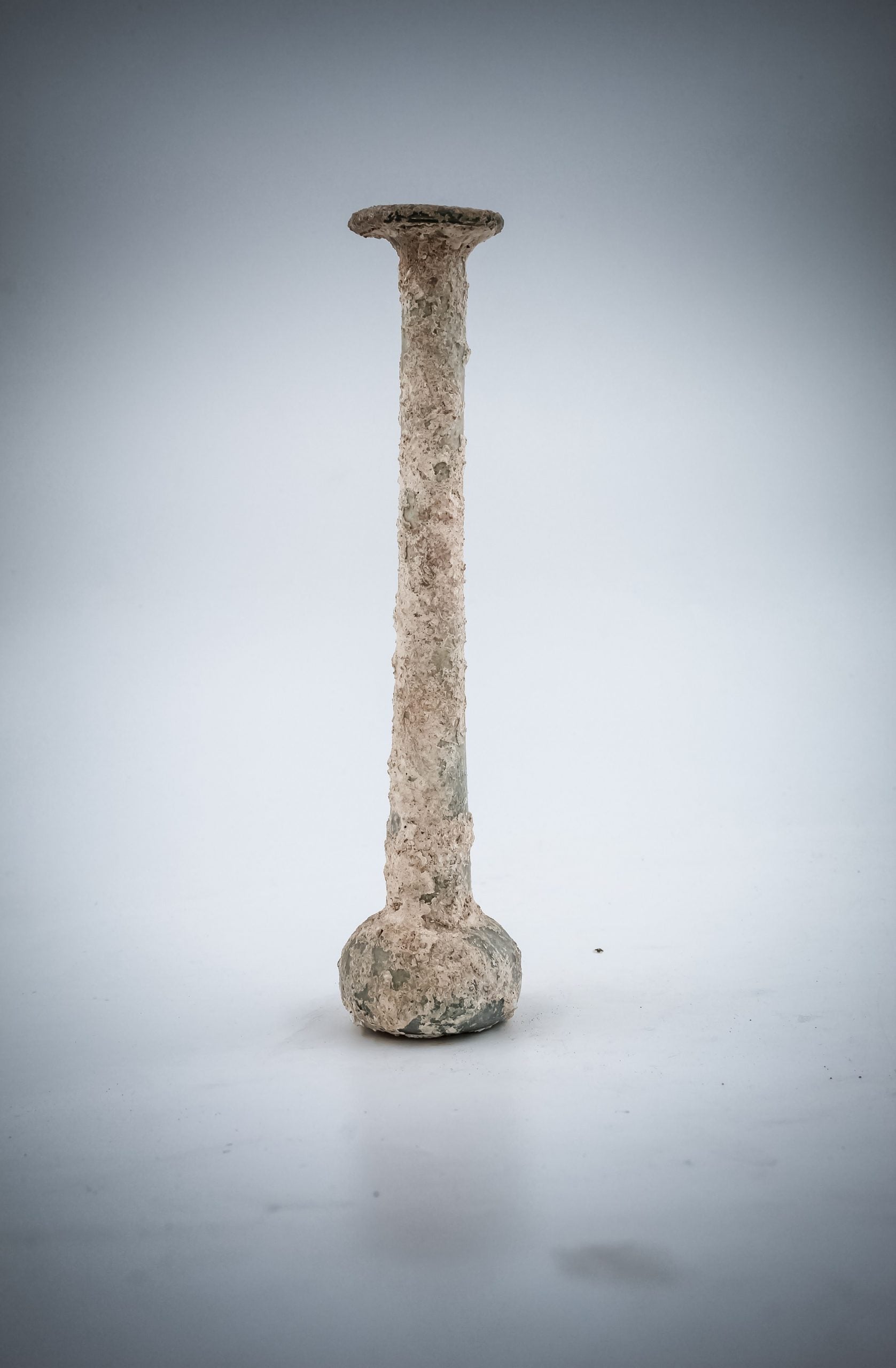 This blown glass vessel features a folded tubular rim, a cylindrical neck that widens toward the bottom, and a squat, globular body with a flat base. One of the earliest types of blown glass, these elongated bottles have a short body and a long neck, allowing for slow pouring of contents in tiny drops. They were commonly used to hold perfumes and scented oils and were often placed in burial caves, earning them the name “tear bottles” as they were believed to collect the tears of mourners.