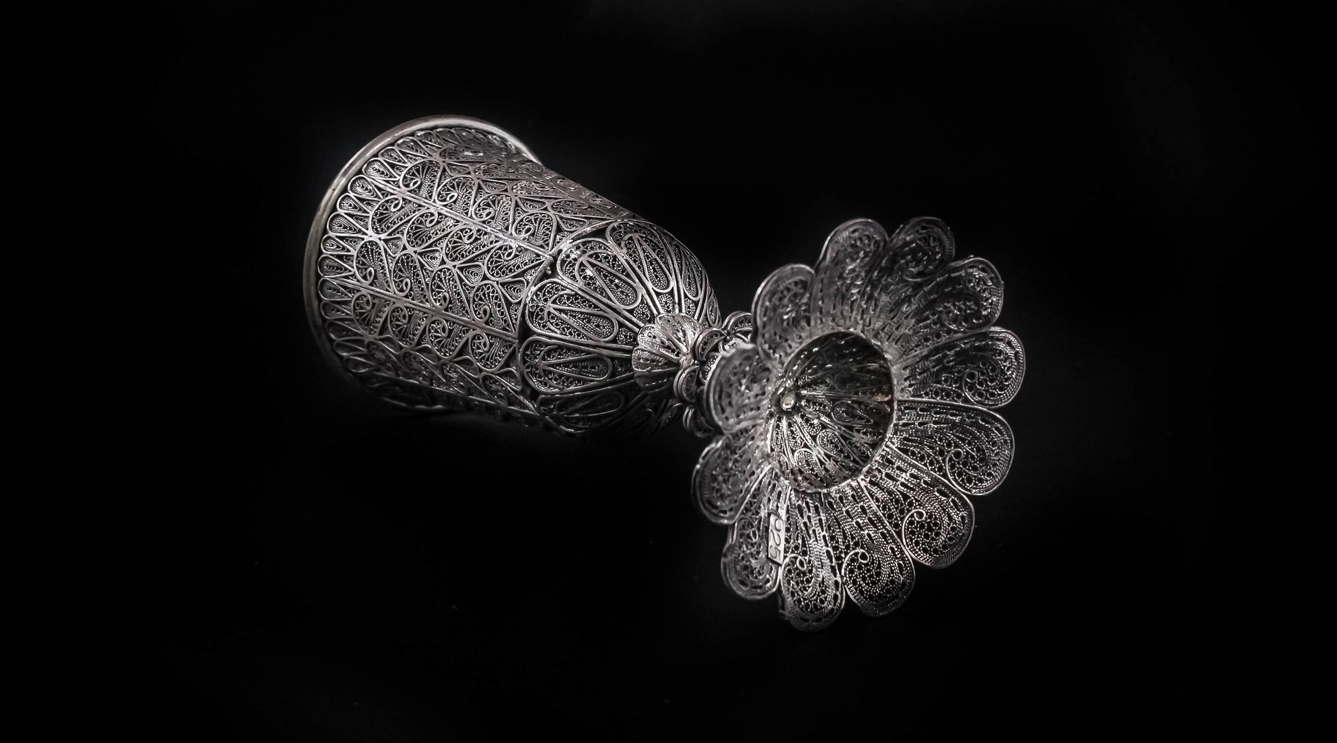 A silver goblet is commonly used for kiddush, but any cup that holds a revi'it—between 90.7 and 161.5 milliliters (3.07 to 5.68 fl oz)—is acceptable. After the recitation, the wine is shared among participants or poured into small cups before the blessing.