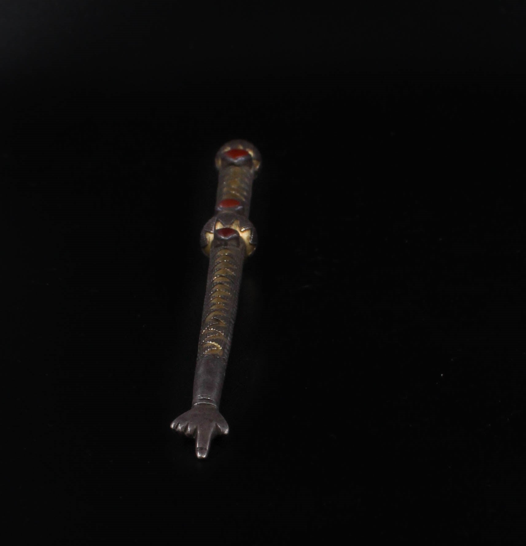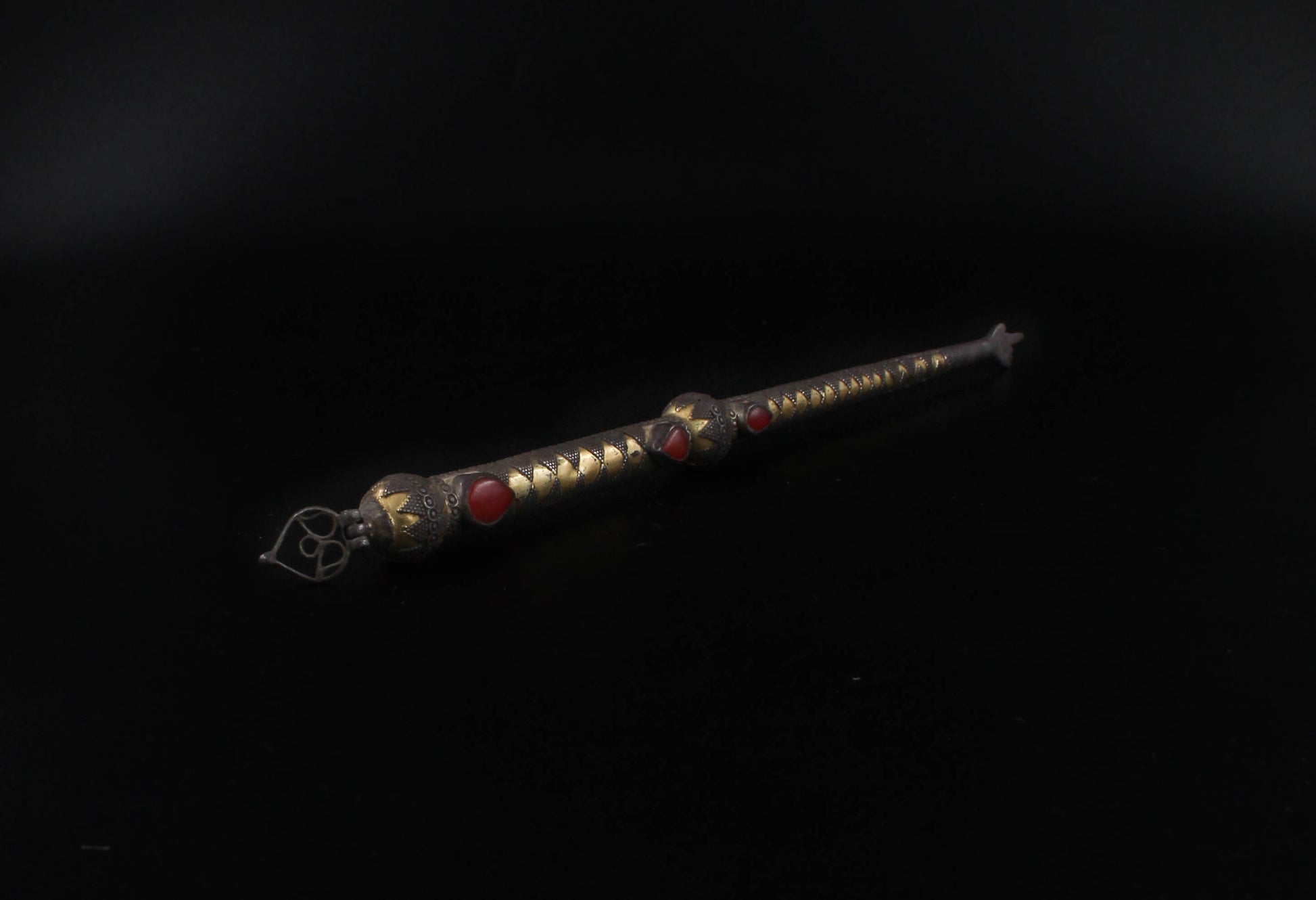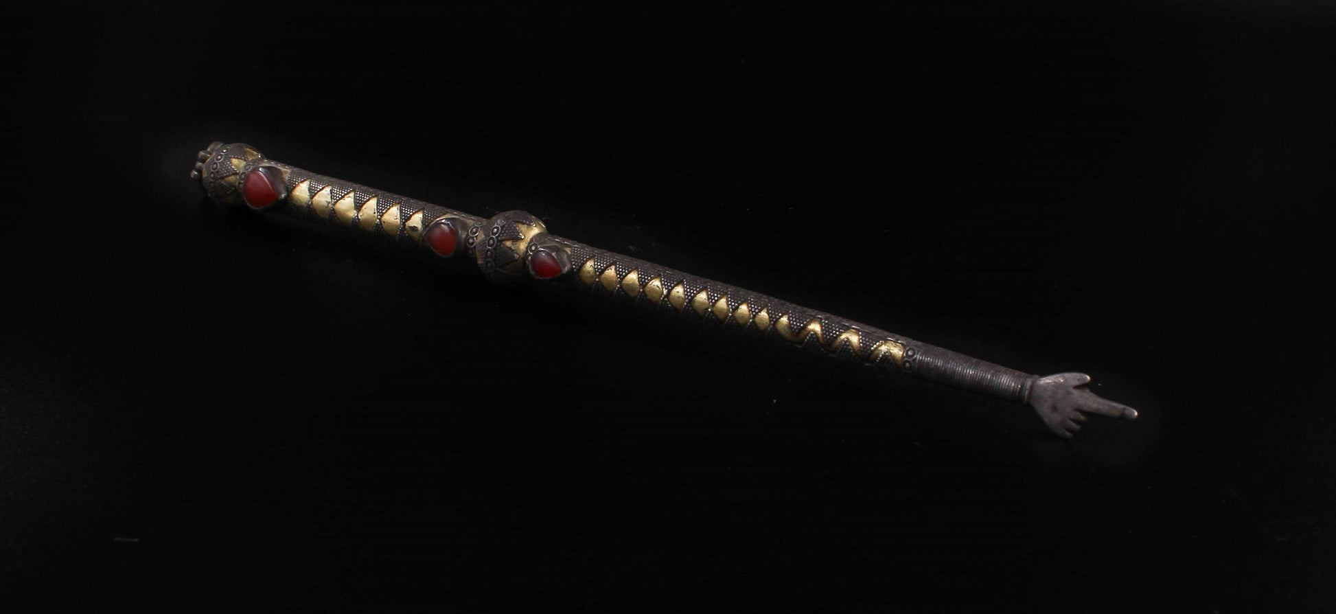 A yad (Hebrew: יד, meaning “hand”; Yiddish: האַנט hant) is a Jewish ritual pointer, commonly known as a Torah pointer, used during Torah readings to follow the text without touching the parchment scrolls. This practice prevents ritual impurity and protects the fragile parchment, which can be damaged by handling. Although not mandatory, the yad is frequently used and is considered a hidur mitzvah, or "embellishment of the commandment." It can be crafted from various materials, with silver being popular, especially for its decorative crown. Typically, a yad resembles a long rod topped with a small hand and an extended index finger. Some may even have a fabric covering.