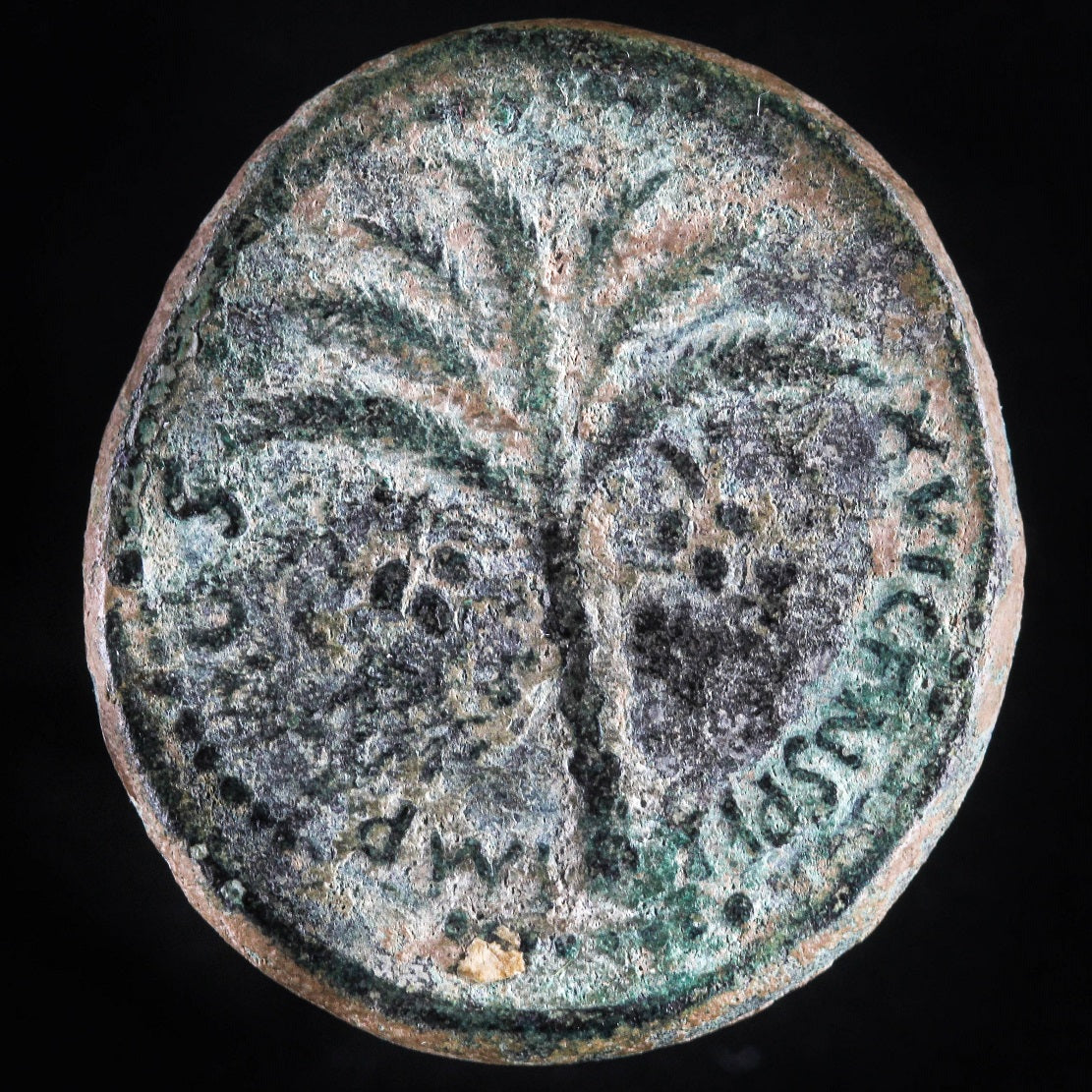 Only bronze ‘Judaea Capta’ coins were struck in Caesarea, in the defeated Roman province of Judea. These coins are much cruder than the Roman issues, and the inscriptions are in Greek rather than Latin. The designs feature the goddess Nike writing on a shield, Minerva with a spear, shield, trophy and palm tree, etc. Most such coins were issued during the reign of Emperor Domitian (81-96 AD).